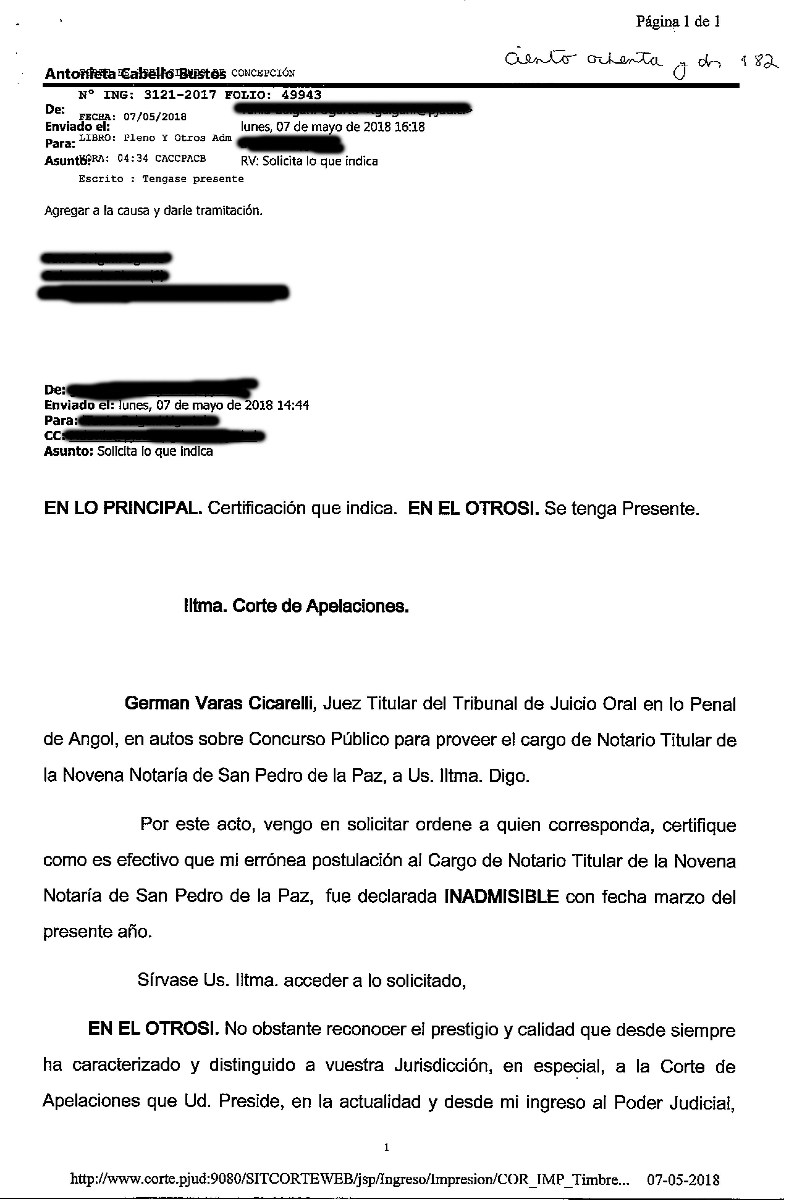 Sin embargo, según un documento oficial de la Corte de Apelaciones de Concepción, la postulación de Varas a la notaría fue declarada inadmisible el 7 de marzo de este año, cuatro días antes del cambio de gobierno. En el texto, Varas reconoce no tener "las competencias profesionales y motivacionales necesarias para proyectarme en dichas funciones".