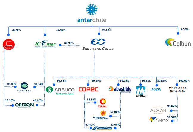 AntarChile posee, a través de dos sociedades, más de 70% de Corpesca, la pesquera investigada por financiamiento irregular de la política en plena tramitación de la Ley de Pesca -también conocida como Ley Longueira-, que benefició precisamente los intereses de la pesquera del grupo Angelini.