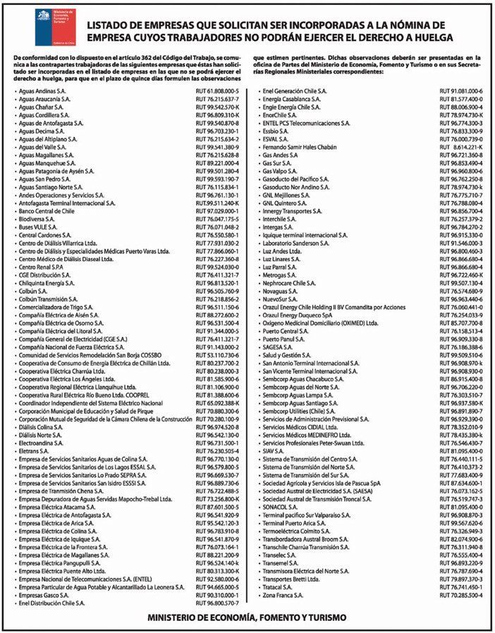 La reforma laboral promovida por el gobierno de la Nueva Mayoría establece que las empresas "estratégicas" son aquellas que presten servicios de utilidad pública, cuya eventual paralización por una huelga provoque un grave daño a la salud, economía, abastecimiento o seguridad del país.