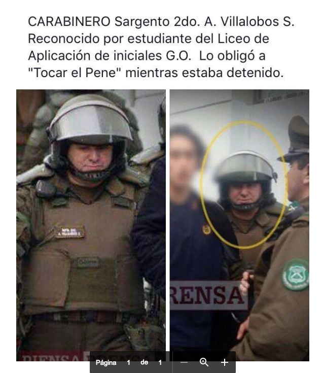 Uno de los hechos más graves, señalan, "fue el que provocó el funcionario de Carabineros Sargento 2° A. Villalobos S. contra un estudiante de sexo masculino, a quien le obligó, bajo coacción, a tocar sus genitales. Lo anterior, en momentos en que no portaba su placa identificatoria, al igual que todo el grupo de carabineros que realizó el procedimiento".