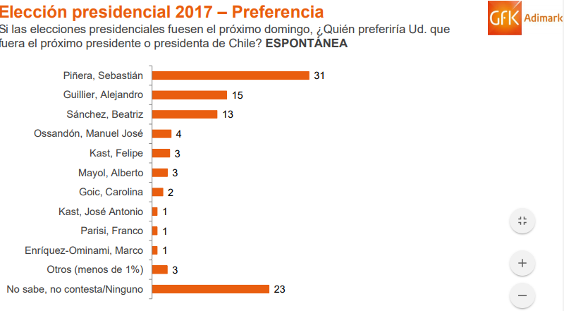 La encuesta muestra a un Sebastián Piñera sólido en primer lugar con un 31%, 6 puntos más que en la última medición de mayo. En segundo lugar y pasando a segunda vuelta se mantiene Guillier con un 15%, pero con una notoria baja de 6 puntos y solo a dos de diferencia de Beatriz Sánchez (13%).