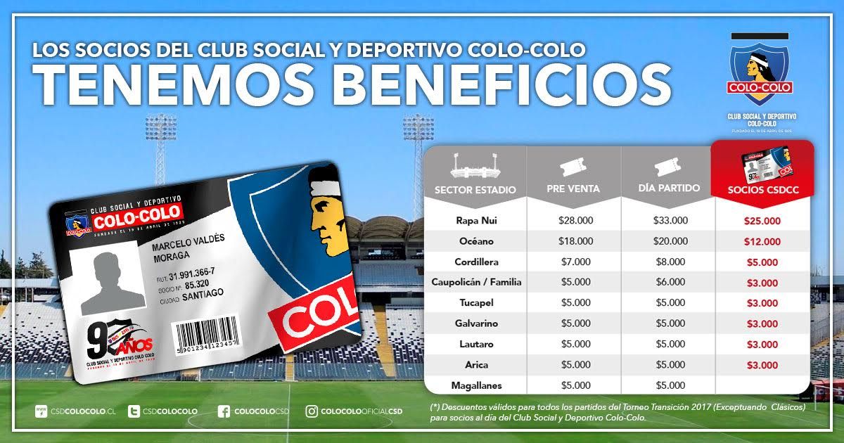 Para poder acceder al descuento, los colocolinos deben hacerse socios o ponerse al día hasta el 23 de julio. Así, obtendrán rebajas de hasta $8 mil pesos en los duelos del Torneo Transición 2017 que comienza el domingo 30 de julio. El beneficio será válido para todos los partidos, excepto para el clásico contra Universidad de Chile, el cual de todos modos tendrá un descuento, pero menor (precio de preventa), pero contando con días de venta exclusiva para socios.