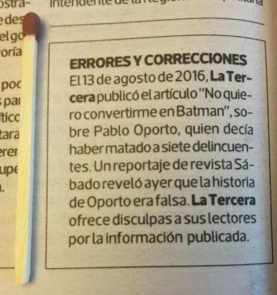 Uno de los medios que tomó su caso fue precisamente La Tercera, que hace unos años publicó una entrevista a Oporto titulada "No quiero convertirme en Batman". Tras conocerse la verdadera historia del comerciante, el medio publicó un mínimo recuadro al día siguiente pidiendo disculpas.