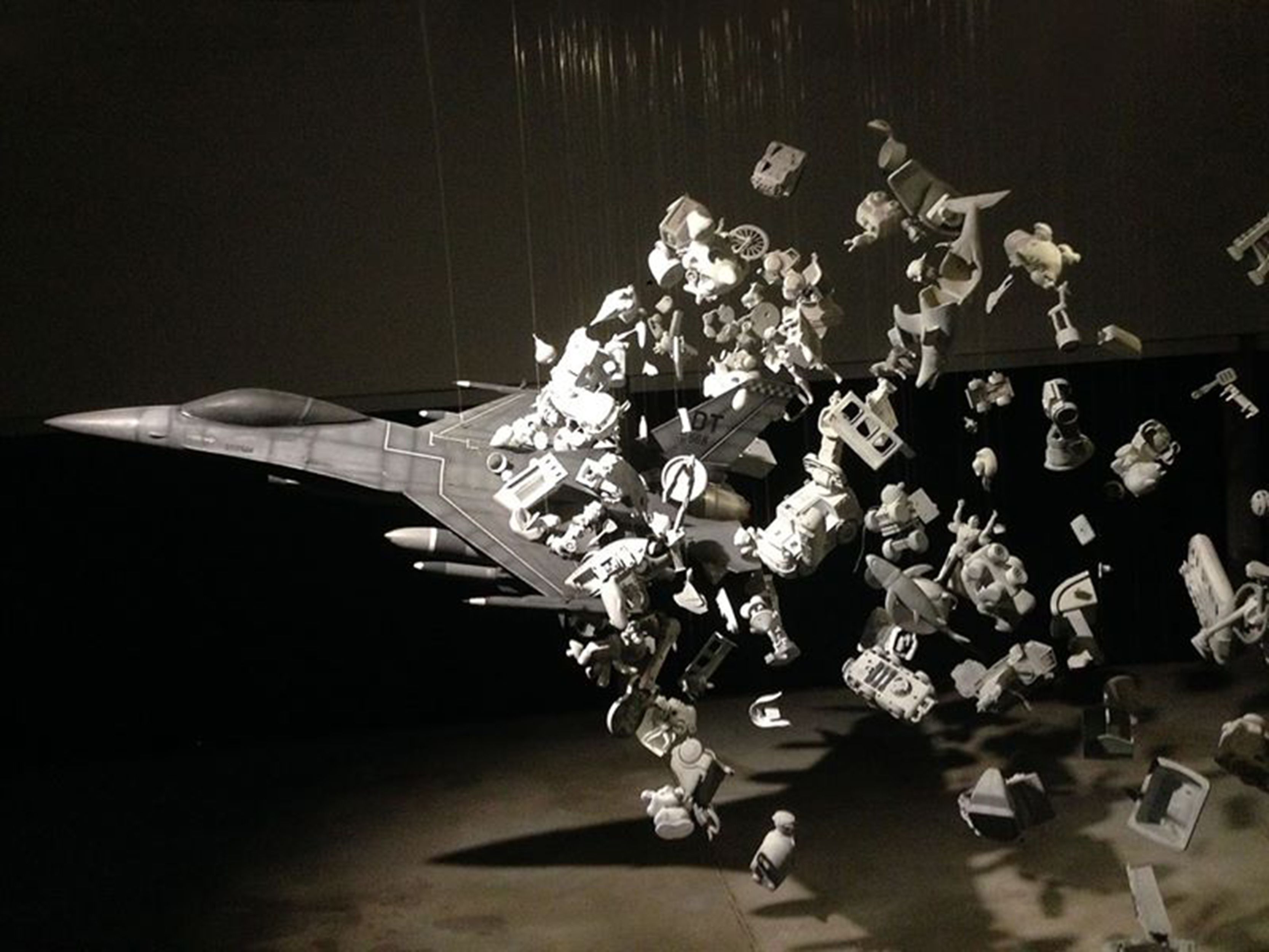 Ahora mismo estoy haciendo un proyecto para Buenos Aires, una de cuyas obras se llama “La barrera del sonido”, es un avión militar M-16 que rompe la barrera del sonido y al hacerlo genera un cono, un efecto físico que se visualiza en una milésima de segundo. Yo estoy recreando ese cono, pero con puros objetos cotidianos que tienen relación con los niños, el juego, la infancia, el hogar... todos esos objetos quedan suspendidos en el aire al romperse la barrera del sonido. Subliminalmente está la realidad que vivimos hoy en día, el caso más directo es Siria, pero hay muchos otros lugares de genocidio de los cuales no se habla porque son lugares que no tiene petróleo o no tienen relevancia geográfica, por lo tanto, pasan a segundo plano.