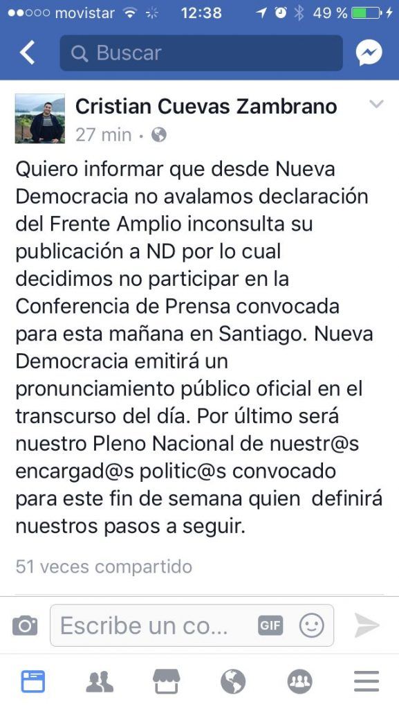 El dirigente del conglomerado, Cristian Cuevas, desde su cuenta de Facebook comunicó que "desde Nueva Democracia no avalamos la declaración del Frente Amplio, inconsulta a su publicación a ND por lo cual decidimos no participar de la conferencia de prensa convocada en para esta mañana en Santiago" y agregó que "Nueva Democracia emitirá un pronunciamiento público oficial en el transcurso del día".