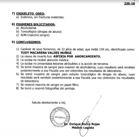 La autopsia de Macarena Valdés, firmada el doctor Enrique Rocco del Servicio Médico Legal de Valdivia, es clara en sus conclusiones: "Asfixia por ahorcamiento", dice como la causa de muerte.