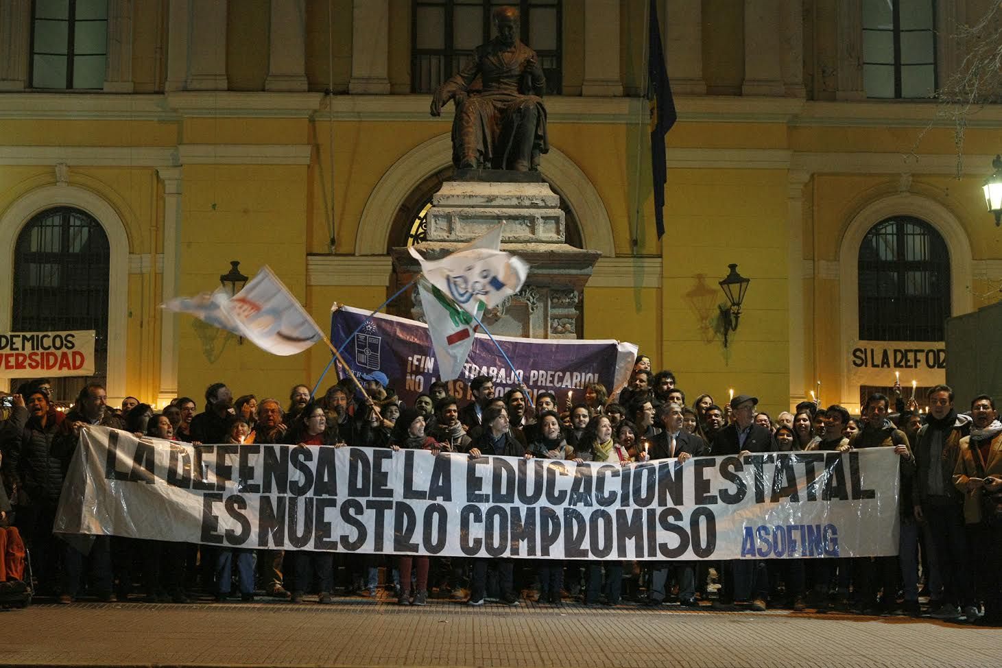 Simbolizando el complejo momento que enfrentan las universidades del Estado ante su rechazo en puntos neurálgicos de la propuesta legal del Ejecutivo, la comunidad universitaria de la Casa de Bello prendió velas en el frontis de la Casa Central, en la Facultad de Derecho y en el Campus Andrés Bello –en el frontis de la Facultad de Arquitectura y Urbanismo-, rindiendo un simbólico apoyo a los planteles estatales y demandando modificaciones al proyecto de Ley sobre Universidades Estatales en marcha.