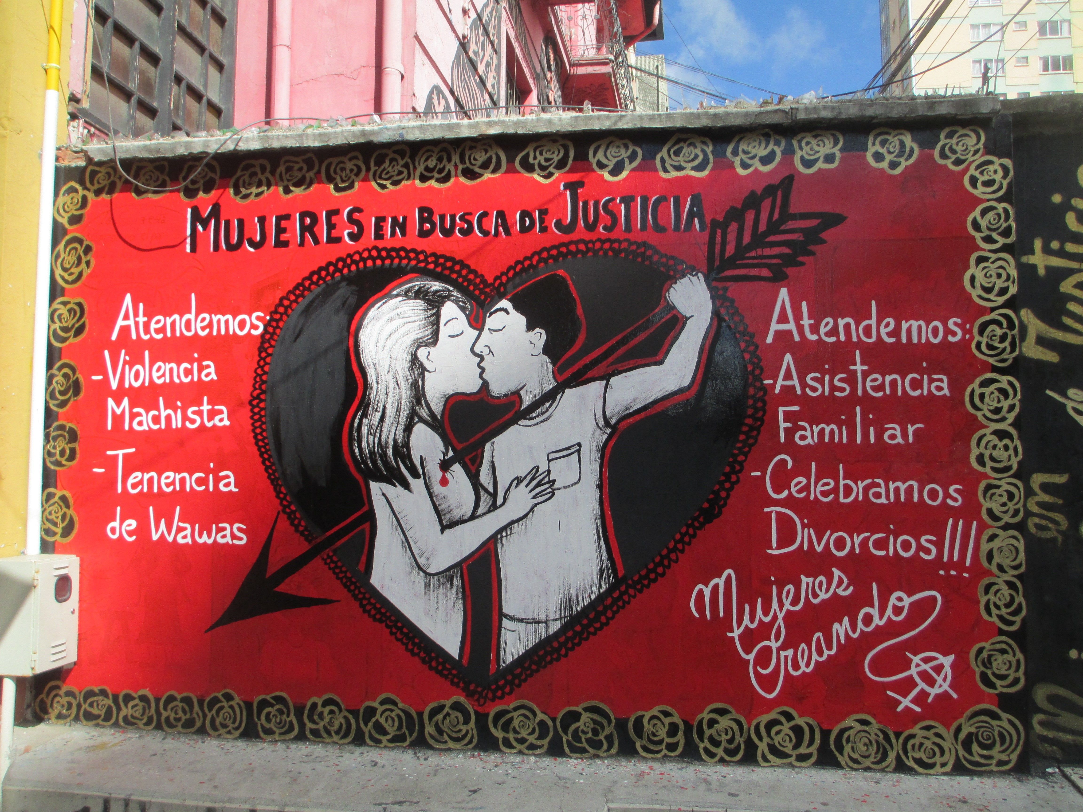 "Ave María llena eres de rebeldía", inscribe una de las frases grafiteras sobre el muro blasfemo de Mujeres Creando. Imaginándose herejes, las mujeres feministas vuelven en las alturas a ser calificadas de malas mujeres, brujas con aguayos, punks y lesbianas masculinas, que se oponen a como la iglesia crucifica a las mujeres. La casa de Mujeres Creando recibe diariamente a mujeres que tienen problemas legales y de violencia en la familia. Mujeres golpeadas, cholitas que no reciben la pensión de su ex marido, son protegidas y asistidas en un pasillo de la casa. Porque el Estado Plurinacional no ayuda a las mujeres. Por esto mismo, en Mujeres Creando son muy críticas al rol de Evo Morales que muchas veces se apropia de discursos pro género, pero en lo concreto las acciones no cambian las desigualdades hacia las mujeres.