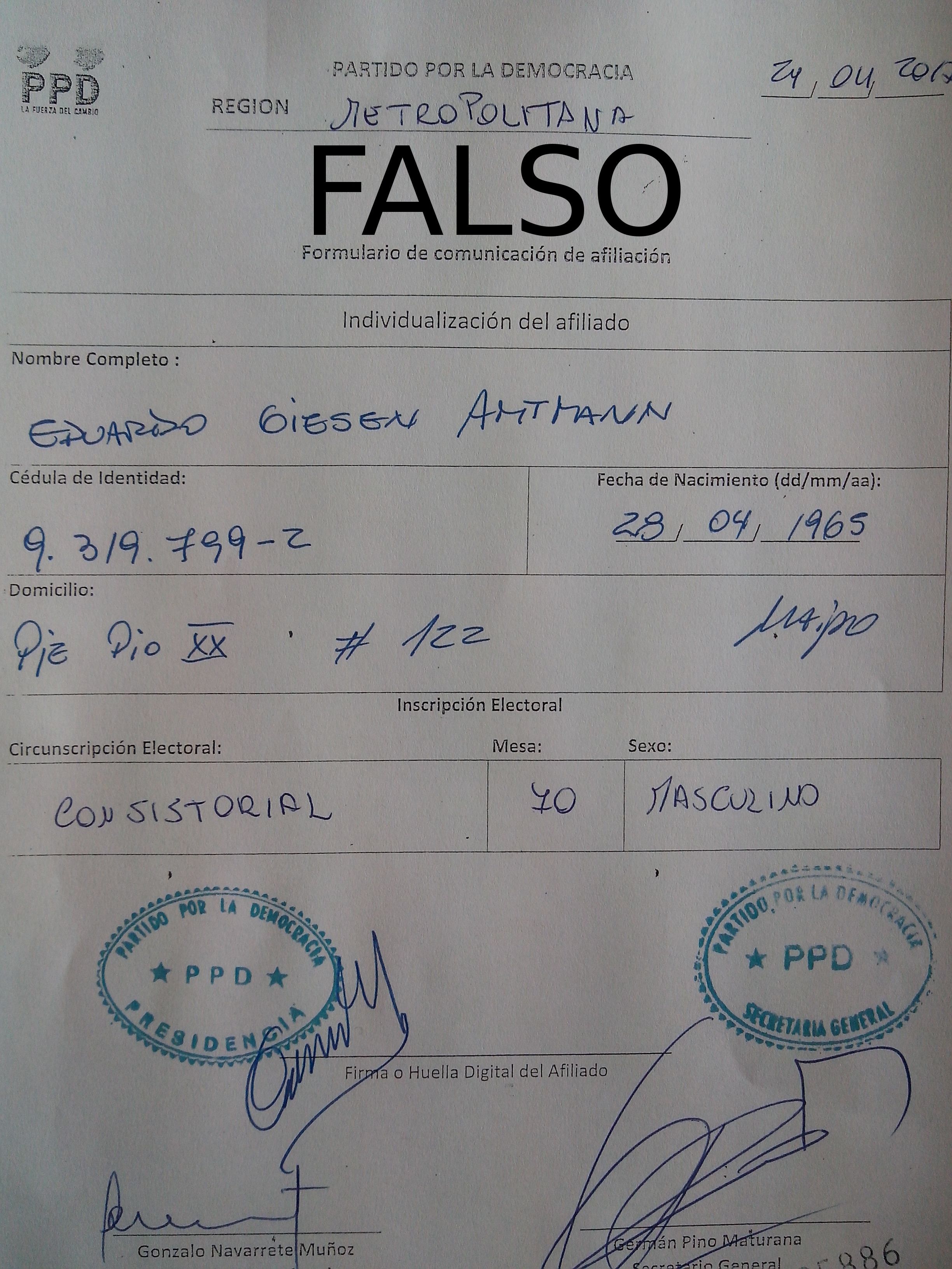 Giesen acudió al Servel para interponer un reclamo formal por estar afiliado sin consentimiento y consiguió la ficha fraudulenta que acreditaba su militancia. Sin embargo, tanto la firma como la dirección eran falsas.