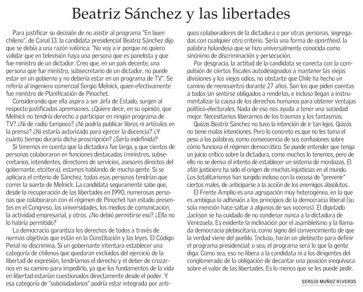 Por otro lado, en El Mercurio resaltaron con singular énfasis la carta escrita por el analista político Sergio Muñoz Riveros -columnista de la supuesta competencia- titulada "Beatriz Sánchez y las libertades".