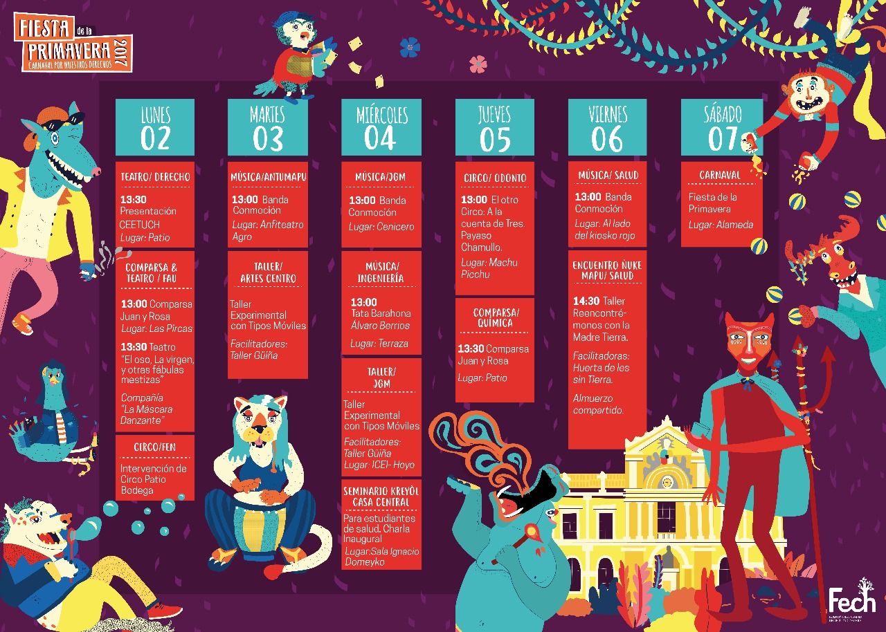 La Fiesta de la Primavera 2017, comienza con una semana llena de actividades abiertas a todo público, las que se realizarán en los distintos espacios de la Universidad de Chile. Con varias intervenciones por día, distribuidas en distintas Facultades, la Chile se llenará de música, teatro, circo, talleres sociales, historia e inmigración.