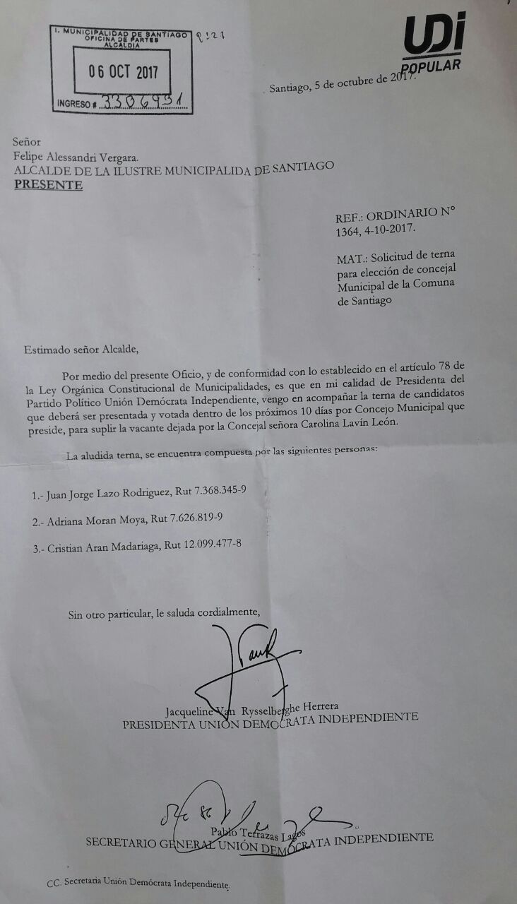Sin embargo, como el Servel aceptó la candidatura a diputada por el distrito 10, la municipalidad –liderada por el alcalde Felipe Alessandri (RN)– entendió que el cargo sí está vacío y la UDI propuso una terna, firmada por su presidenta Jacqueline Van Rysselberghe, y encabezada por Juan Jorge Lazo, vinculado a la privatización de la Empresa Nacional del Carbón (ENACAR) y del diario La Nación.