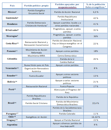 También existen algunos grupos evangelistas que apoyan a gobiernos progresistas como en Nicaragua y en menor medida en El Salvador, manejando un discurso pragmático de funcionalidad con el gobierno o, como ocurrió en el proceso de formación y desarrollo de la democracia cristiana, sectores de la iglesia interpretan la función social de la iglesia de formas distintas a la neoliberal. En general, por sus adhesiones o apoyos a partidos ultra conservadores como se observa en la Tabla 1, se puede afirmar que los evangelistas están más cerca del neoliberalismo que de la justicia social.