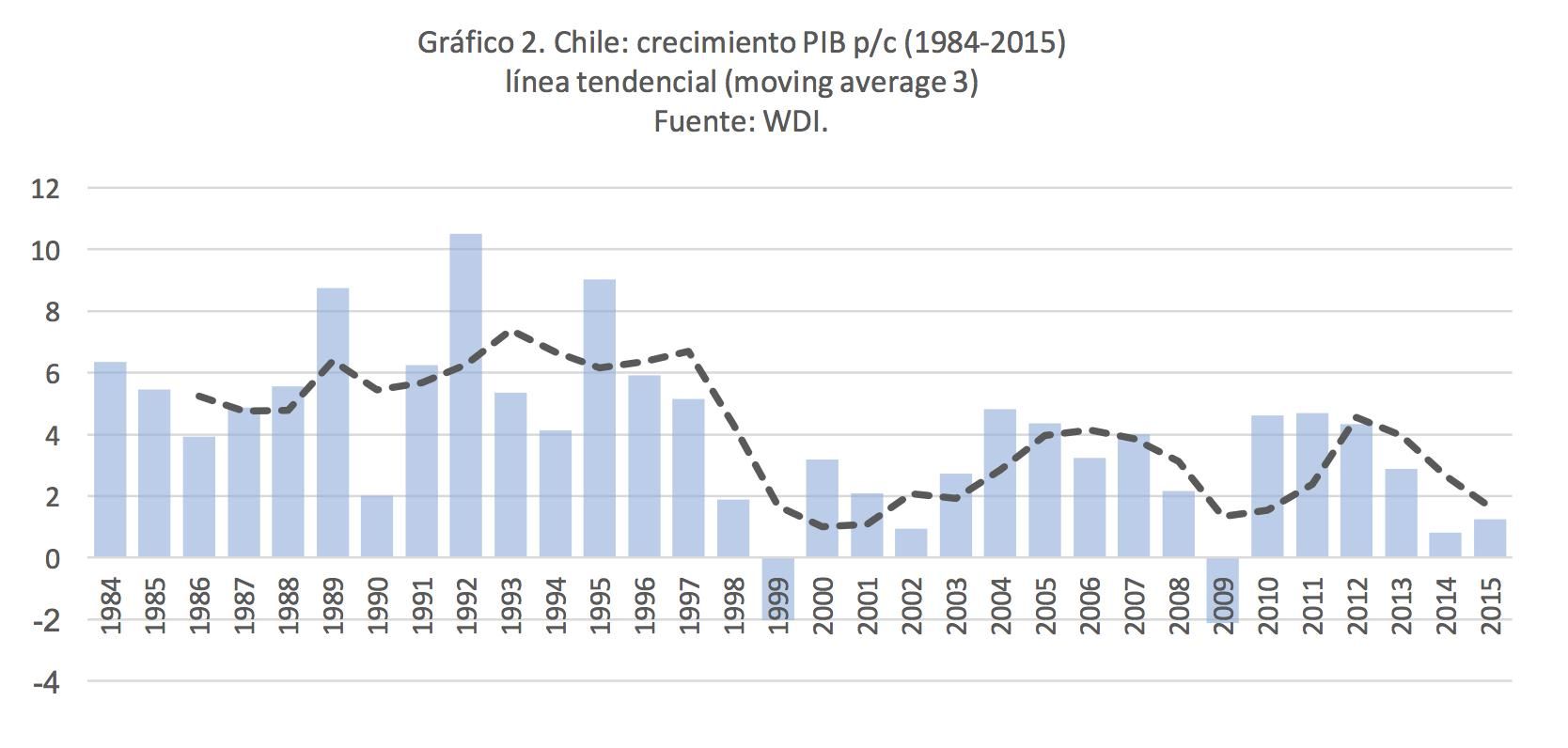 Sin embargo, el aumento del precio del cobre no trajo consigo un nuevo dinamismo como el del periodo 1986-1997, sino una mera reactivación temporal de una situación de estancamiento. En efecto, luego de dicho periodo, Chile vuelve a presenciar el estancamiento que nos dejara el fin del ciclo de expansión del 1998 (ver gráfico 2).