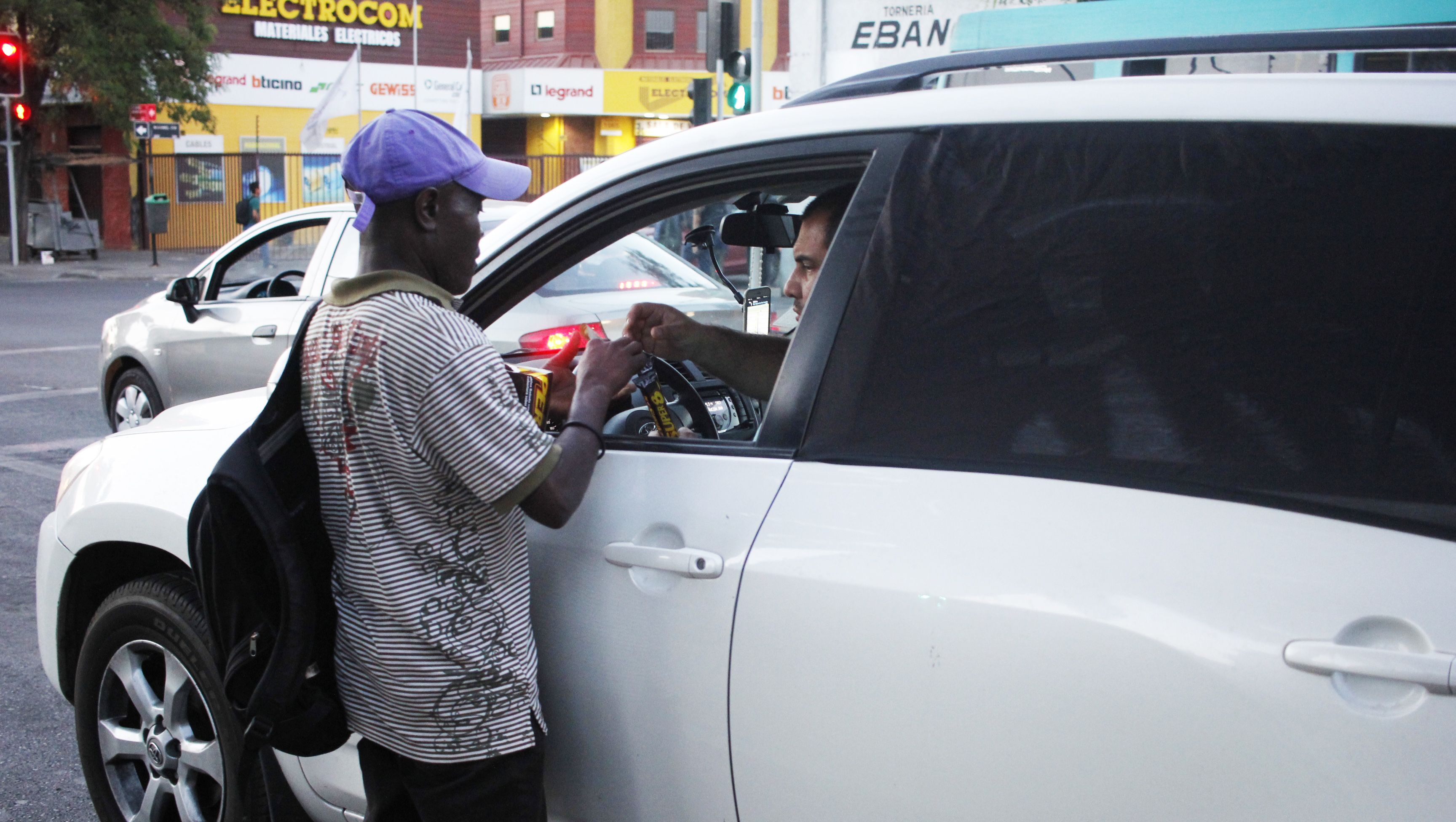 En la intersección de San Diego con el Parque Almagro trabaja Misul, oriunda de Puerto Príncipe. Narra lo difícil que ha sido adaptarse a Chile: “Se gasta mucha platita en venir, casi $3000 dólares, y hay días donde no vendo casi nada, a lo más una caja o dos”. Apenas termine una venta y el semáforo dé la luz verde, vuelve a la esquina donde se emplaza la Universidad Central y mira al jardín interior. Ahí está saltando y corriendo Ashley, su pequeño hijo de 7 años, junto a otro niño chileno. A Misul le brilla la cara: “Llego aquí a las nueve y me voy a buscar a mi hijo al colegio a las una para almorzar”. Luego, concluye: “Cómo voy a trabajarle a un chileno, si con suerte me alcanza para mí”, y ríe.