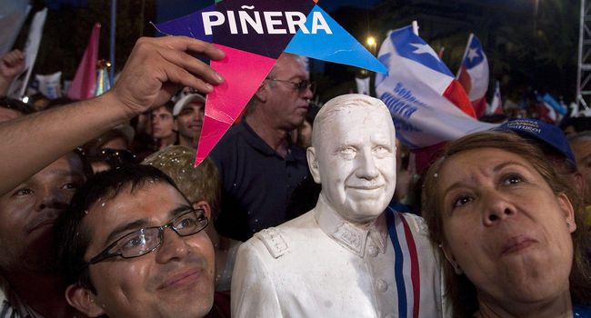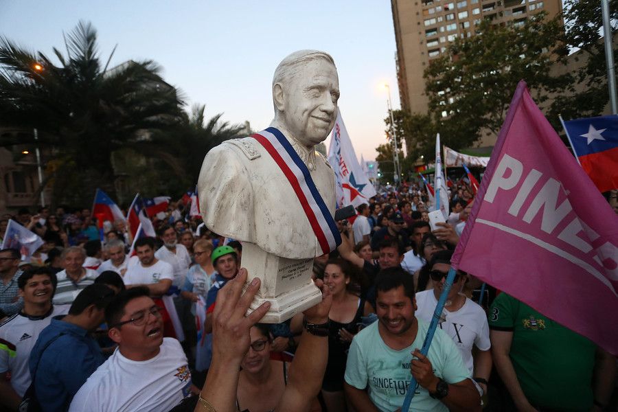 En medio de los festejos por la abultada victoria del empresario en su intento por retornar a La Moneda, partidarios del abanderado de Chile Vamos celebraron nuevamente -reviviendo el estilo de 2010, cuando Piñera resultó electo por primera vez- junto a una especie de escultura o busto del dictador Augusto Pinochet.