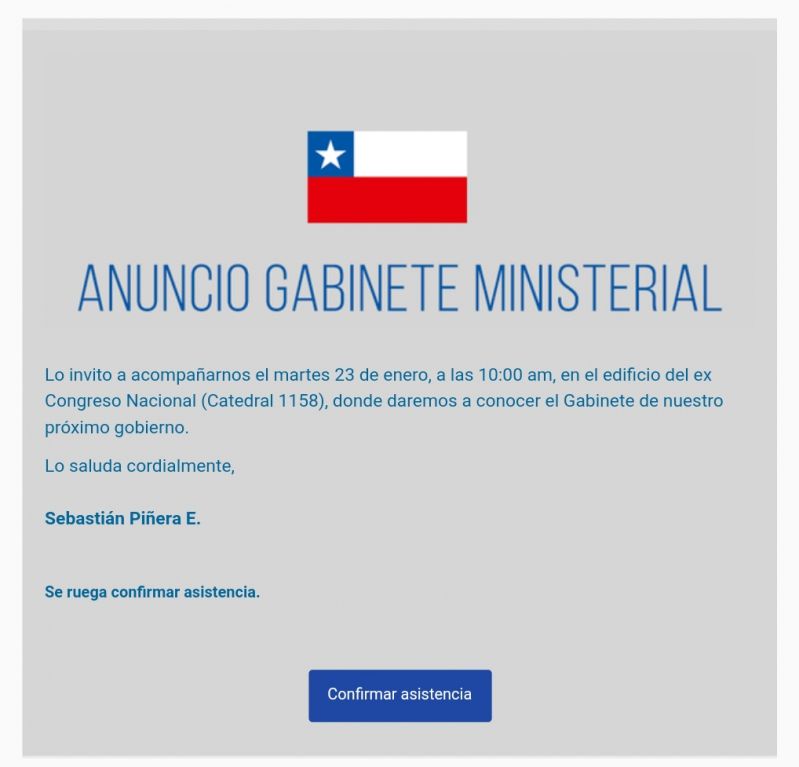 La ceremonia se realizará en la sede del Congreso en Santiago, a partir de las 10:00 horas. Durante las últimas semanas, la conformación de los secretarios de Estado ha provocado molestia e incomodidad al interior de Chile Vamos, sobre todo luego de que el propio Piñera afirmara que "los partidos quedaron bien con toda su gente, pero renunciaron a ejercer su influencia".