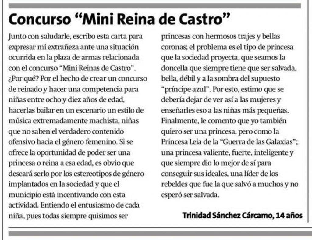 A través de una carta al director del diario La Estrella de Chiloé, una niña de 14 años llamada Trinidad Sánchez, cuestionó la realización reciente del concurso de belleza que coronó a la "Mini Reina de Castro".