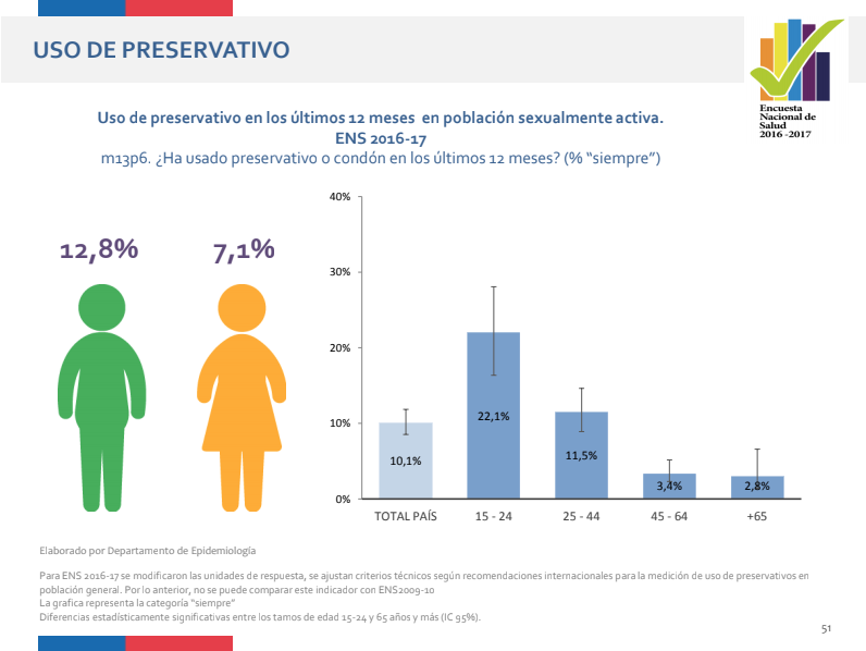 “Es preocupante el antecedente sobre el uso del condón. Es el principal método de barrera para prevenir la transmisión no sólo del VIH, sino que de otras enfermedades de transmisión sexual”, comenta María Paz Bertoglia, epidemióloga y salubrista de la Universidad de Chile. Según la ENS 2016–2017, sólo un 10% de la cifra total país (15 años a +65) responde usar siempre condón.