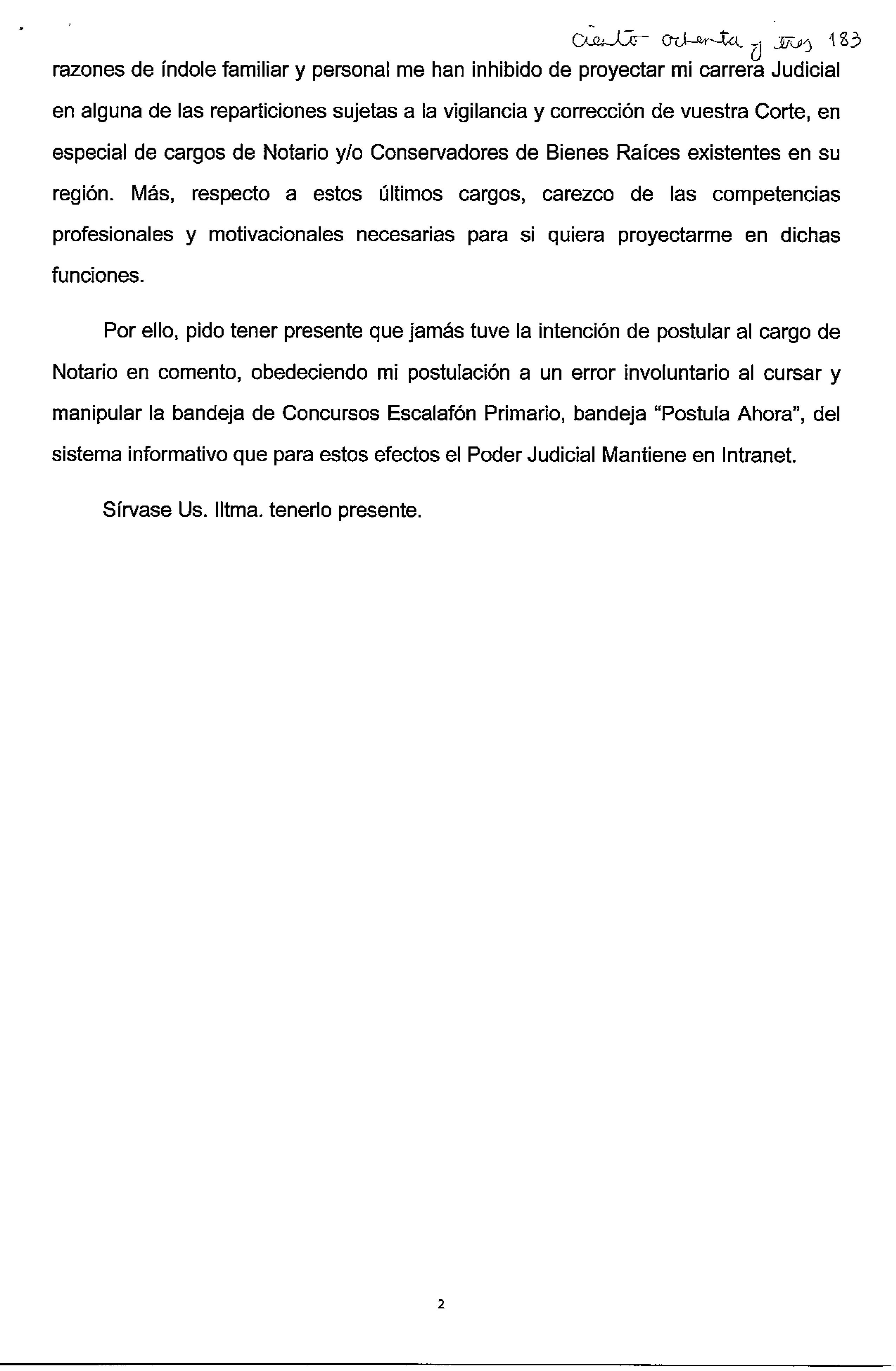 "Pido tener presente que jamás tuve la intención de postular al cargo de notario en comento, obedeciendo mi postulación a un error involuntario al cursar y manipular la bandeja de Concursos Escalafón Primario, bandeja 'Postula Ahora', del sistema informativo que para estos efectos el Poder Judicial mantiene en Intranet".
