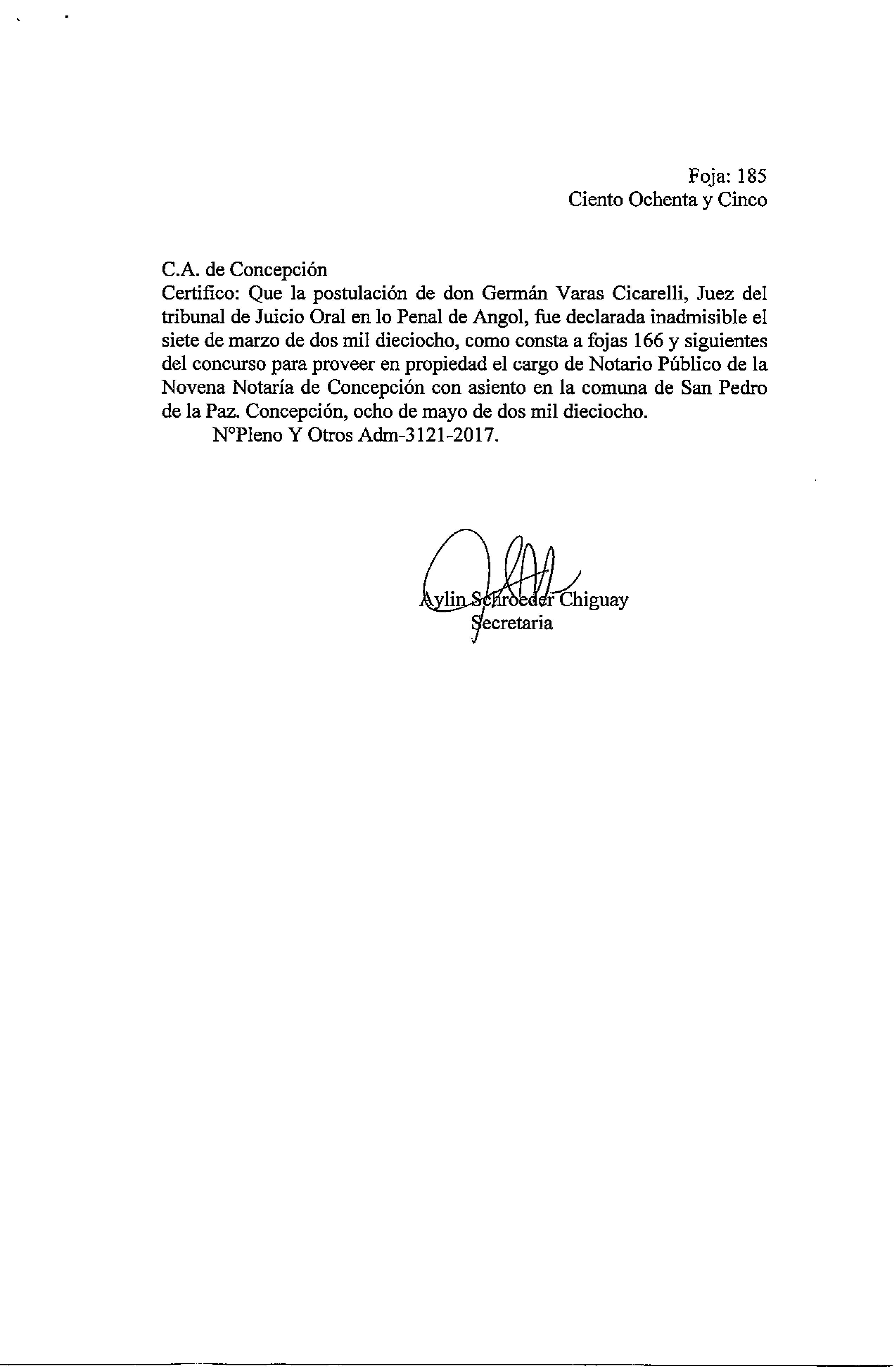 Sin embargo, según un documento oficial de la Corte de Apelaciones de Concepción, la postulación de Varas a la notaría fue declarada inadmisible el 7 de marzo de este año, cuatro días antes del cambio de gobierno. En el texto, Varas reconoce no tener "las competencias profesionales y motivacionales necesarias para proyectarme en dichas funciones".