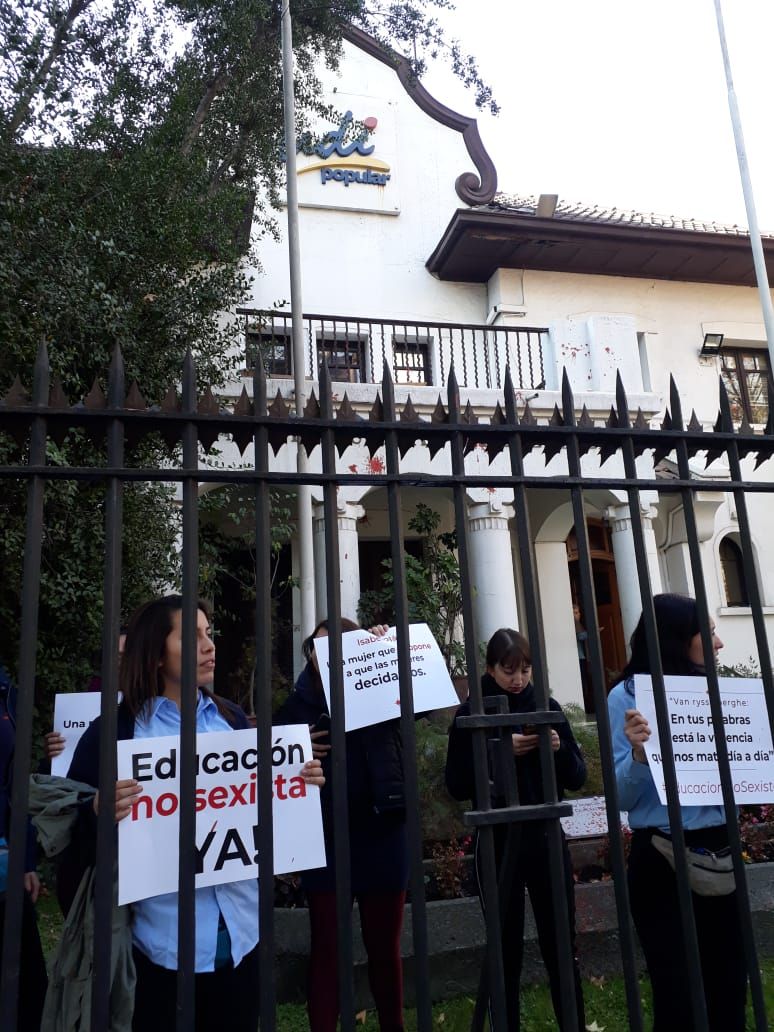 Las estudiantes llegaron con una serie de pancartas relativas a la educación no sexista, el derecho al aborto y en contra de las mujeres del partido en altos cargos institucionales, como la ministra de la Mujer, Isabel Plá, y la senadora Jacqueline van Rysselberhe.