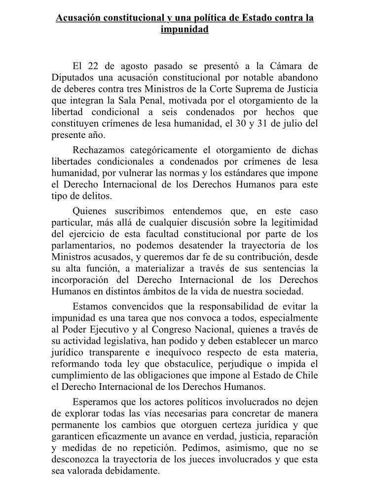 "Quienes suscribimos entendemos que, en este caso particular, más allá de cualquier discusión sobre la legitimidad del ejercicio de esta facultad constitucional por parte de los parlamentarios, no podemos desatender la trayectoria de los Ministros acusados, y queremos dar fe de su contribución, desde su alta función, a materializar a través de sus sentencias la incorporación del Derecho Internacional de los Derechos Humanos en distintos ámbitos de la vida de nuestra sociedad", dice la misiva.