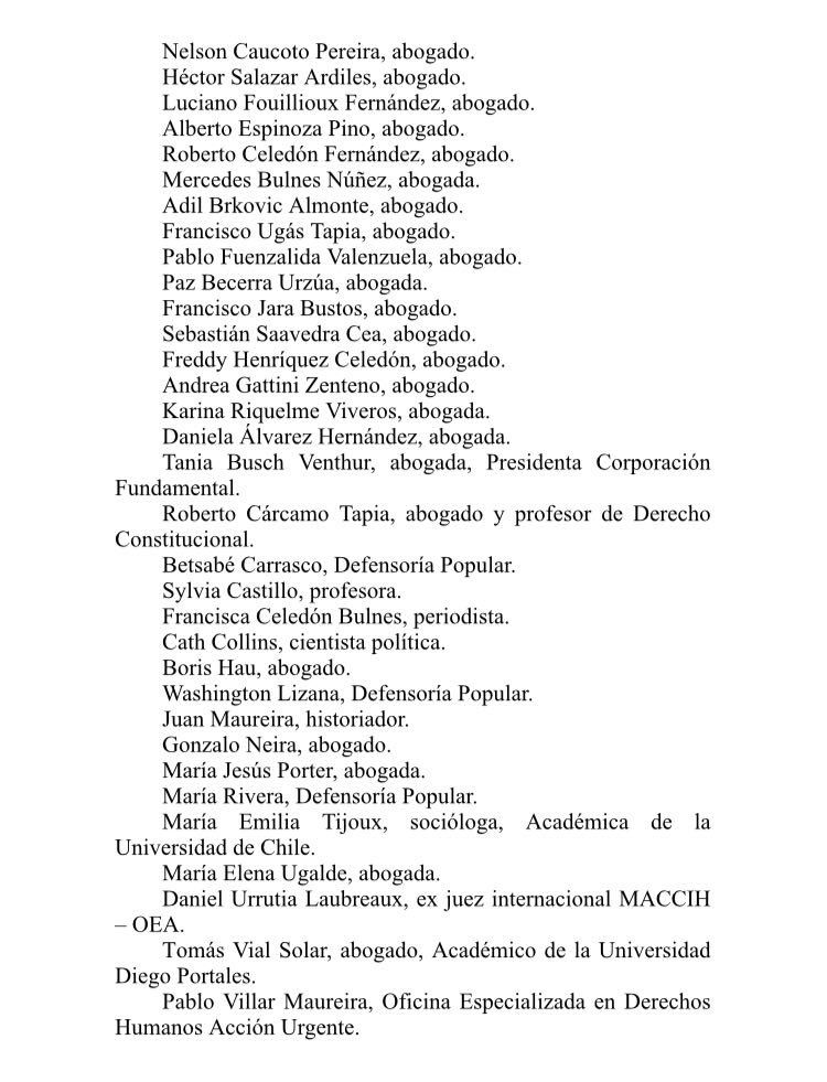 Entre los firmantes se encuentran conocidos litigantes en causas de Derechos Humanos, como Nelson Caucoto, Héctor Salazar y Roberto Celedón, además de otros abogados vinculados a la DD.HH. como Sebastián Saavedra, Karina Riquelme y académicos como María Emilia Tijoux y Cath Collins.
