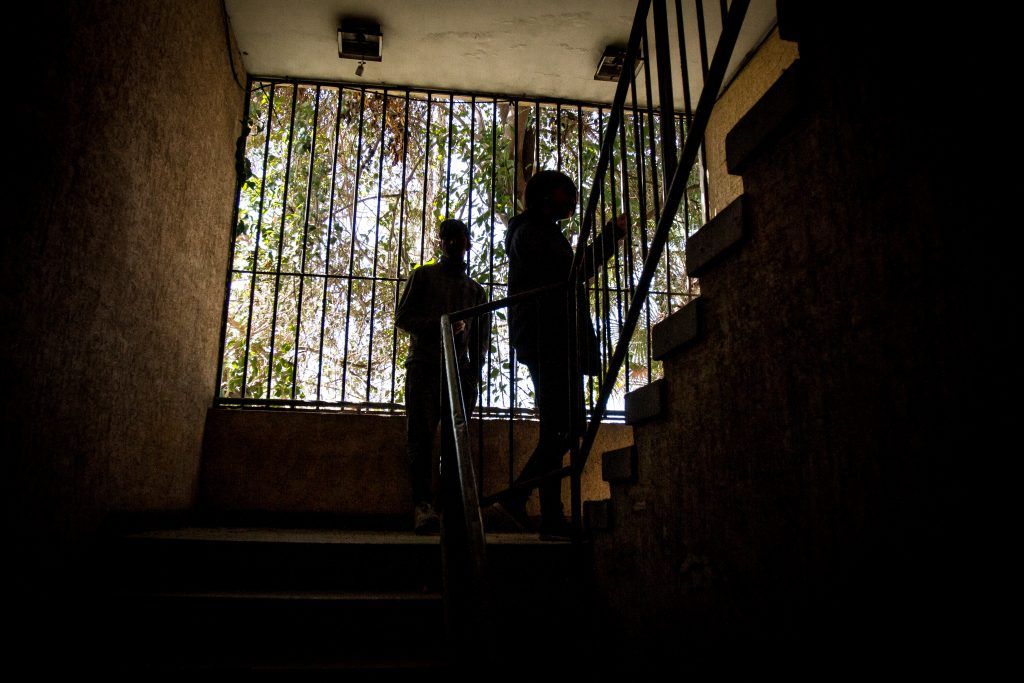 Las escaleras están colmadas de vidrios rotos, crujen al pisarlos y lo que sigue son espacios laberínticos y salas oscuras donde hoy duermen nueve adolescentes. Las ventanas están quebradas, algunos formularios y un cassette de Nat King Cole reposan en una mesa como reliquias de otra vida. Un olor picante quema la nariz, quizá es la mezcla de los objetos quemados para capear el frío, la marihuana y los desechos de baños que han improvisado en algunas esquinas. El vaho fétido inunda todo el lugar.