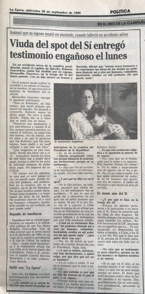 Y un día como hoy, pero hace 20 años, el diario La Época publicaba una entrevista con la viuda del capitán Roberto Goycoechea tras la participación de la mujer en el spot televisivo, en el que daba a entender que su muerte se debió a a un atentado y no a un accidente.