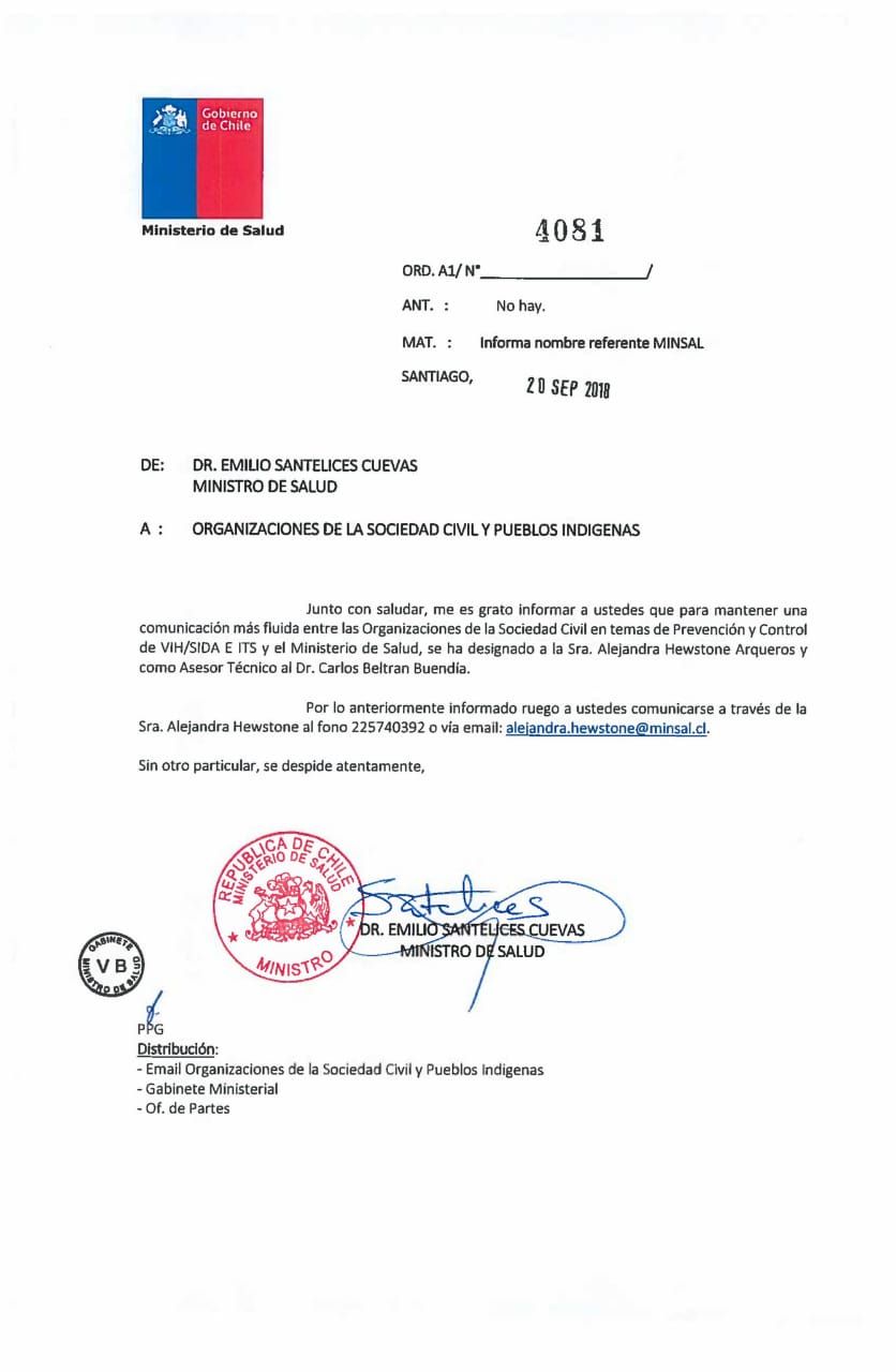 En oficio ordinario 4081 del 20 de septiembre de 2018, el Ministro de Salud Sr. Emilio Santelices Cuevas informa que: “Junto con saludar, me es grato informar a ustedes que para mantener una comunicación más fluida entre las Organizaciones de la Sociedad Civil en temas de Prevención y Control de VIH/SIDA e ITS y el Ministerio de Salud, se ha designado a la Sra. Alejandra Hewstones Arquero y como Asesor Técnico al Dr. Carlos Beltrán Buendía”.