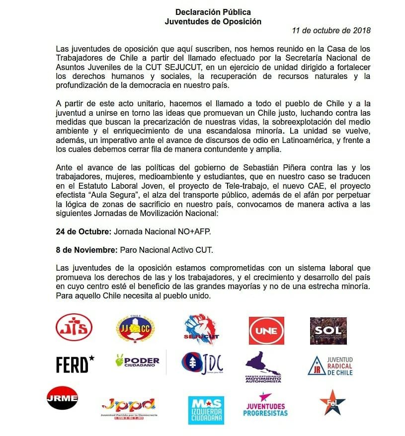 En su declaración pública, las organizaciones llamaron a que las movilizaciones de marcha nacional No + AFP de este 24 de octubre y el paro nacional convocado por la CUT para el próximo 8 de noviembre, deben ser instancias para protestar en contra de las políticas del gobierno de Sebastian Piñera como el Estatuto Laboral Joven, el proyecto de Tele-trabajo, el nuevo CAE, el proyecto efectista “Aula Segura”, el alza del transporte público y el afán por perpetuar la lógica de zonas de sacrificio en nuestro país.