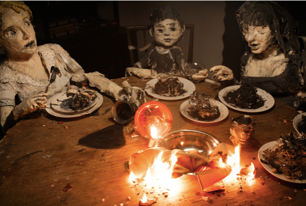 En La Casa Lobo vemos aparecer a María, una joven alemana cuya forma va desde la pintura hasta la materialidad del papel maché, desde las siluetas de su sombra hasta la fragilidad de su voz. María se escapa de Colonia Dignidad, con el único fin de ser libre, mientras la persigue un un lobo, del cual se refugia en una casa en el medio del bosque. En este bosque se hace amiga de dos cerditos, Ana y Pedrito, que pronto se convertirán en sus compañeros, en sus discípulos, en sus criados, en sus esclavos y, finalmente, en sus amos. En esta secuencia de días que pasan, de horas que transcurren, de velas que se agotan en un segundo y de relojes que avanzan como si los minuteros contaran los segundos, María escucha al lobo que, desde lejos, le aconseja renunciar a su rebeldía. “Marrría! Oh, Marrría!”, le dice el lobo. María, segura de su decisión, se mantiene firme, mutando junto con los papeles, la pintura y las esponjas que León y Cociña pusieron a convivir.