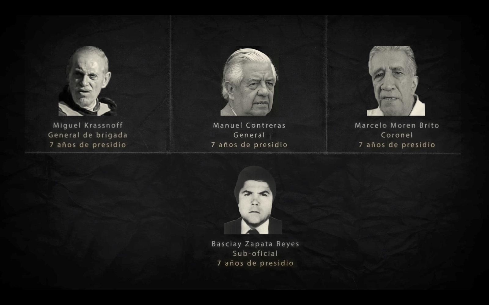 Y al final de cada capítulo termina con la exhibición de los agentes involucrados de los crímenes, con su respectiva foto, nombre, cargo en el aparato represivo y años de condena relativos al caso presentado. Sin embargo, esta parte desde la señal de Luksic nunca la mostraron, solo estuvo disponible en su versión de Youtube.