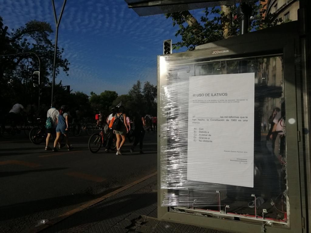 Acabo de ver que unos chicos colgaron una hoja de Facsímil como cartel en las protestas chilenas y eso me emociona inmensamente, porque es una forma de estar presente. Hace tres años que vivo fuera y, aunque voy seguido a Chile, estos días siento la distancia de otra manera, multiplicada por mil. Paso todo el día pegado a la radio y a las redes sociales y hablando con mis amigos por teléfono en altavoz mientras juego con mi hijo y unas jirafas de lana oaxaqueña y me pregunto cómo voy a contarle, más adelante, esta historia. Cómo voy a contársela a él y a mí mismo. Tiempos como estos inevitablemente te llevan a preguntarte cuántos metros de felicidad necesitas, qué tanto estás dispuesto a ampliar la casa imaginaria donde caben todas las personas que quieres proteger.