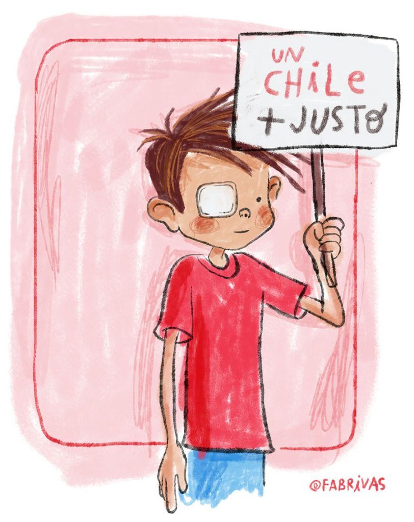 Un caso común es la utilización de Condorito, el más popular de los personajes chilenos, firmado por Pepo y –ya en la industria cultural– realizado por decenas de dibujantes firmados con la marca Pepo. Por definición editorial, Condorito no explicita discursos políticos. Sin embargo, muchos de quienes reconocen su popularidad, por irreverencia o admiración, lo dibujan protagonizando versiones que nunca publicarían sus dueños y editores. Pienso en las imágenes de Condorito y Coné heridos en los ojos por los balines disparados por los Carabineros, representados por Pepe Cortisona, el insoportable archienemigo de Condorito, que exige una explicación y claramente llevaba un cartel que dice “¡Fuera el roto Piñera!”. El escenario es la Plaza Italia, resignificada también como la “Plaza de la Dignidad”. Es decir, con formato de portada de la revista el mundo de Condorito es reconocible, aunque la referencia es un mundo que Condorito (“apolítico”) no visita. En esta línea está la imagen de Papelucho –el niñito inocente de Marcela Paz- con su ojo parchado en una ilustración de Fabián Rivas. “Papelucho baleado, con un parche, su ojo dañado, cercenado, tapado con un parche, quedará para la historia”, escribió Alberto Fuguet comentando el dibujo en La Tercera.