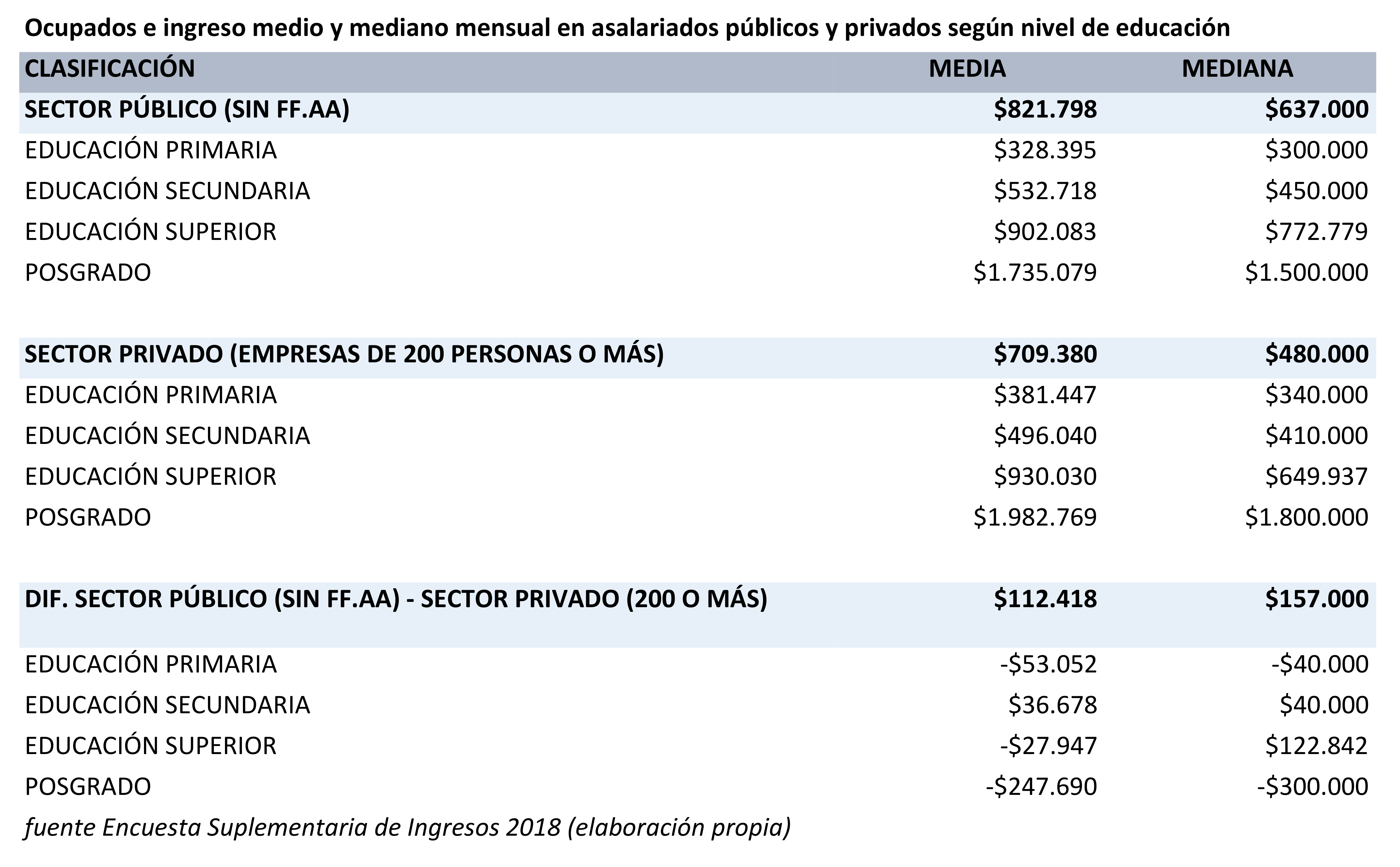 Si se miden las remuneraciones de ambos sectores comparativamente, sin considerar las amplias diferencias de composición entre el empleo público y el del sector privado, tanto en media, como en mediana, el resultado parece favorecer a esta hipótesis.