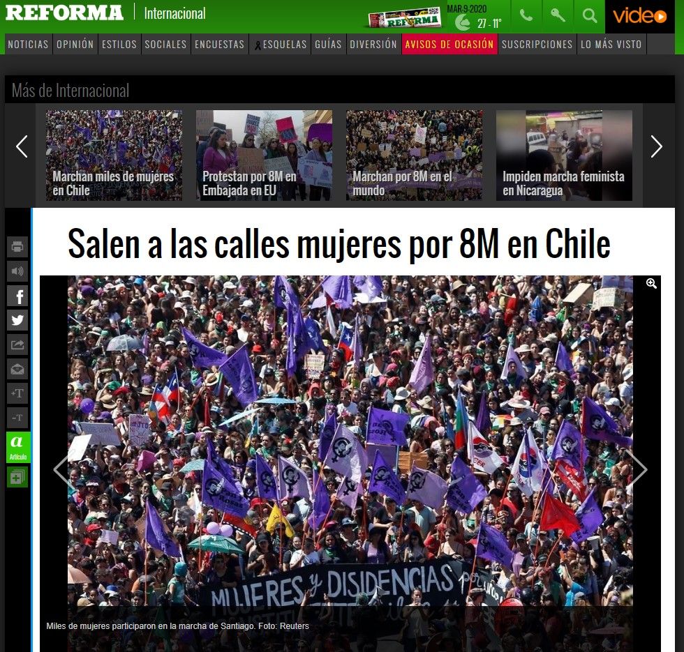 En México en tanto, La Reforma tituló: "Salen a las calles mujeres por 8M en Chile".