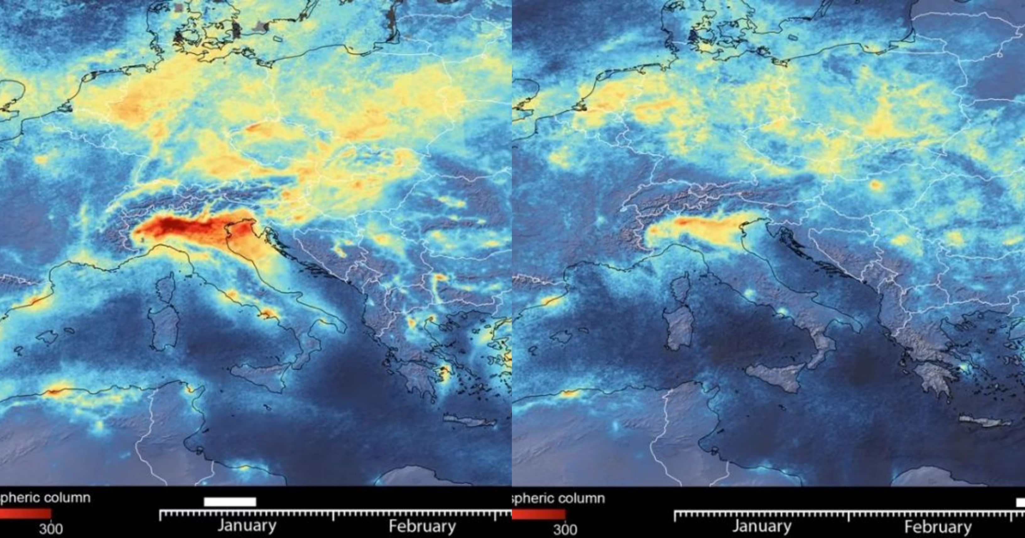 Imagen de la contaminación en Italia en Enero de 2020 vs. Marzo del mismo año. Crédito: ESA datos del satélite Copernicus Sentinel-5P[/caption]
