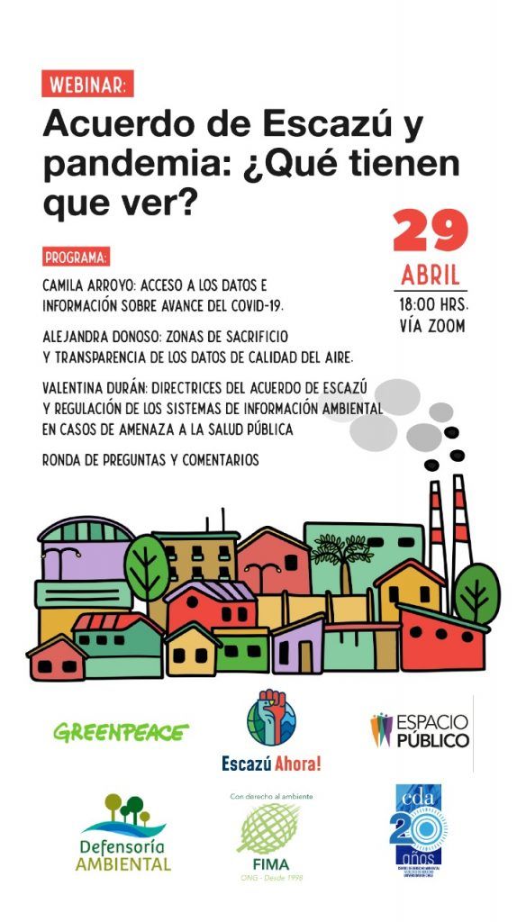 Hoy miércoles 29 de abril a partir de las 18:00 hrs se realizará, vía Zoom, el Webinar: "Acuerdo de Escazú y Pandemia: ¿Qué tienen que ver?", el cual tiene como objetivo analizar las fortalezas y debilidades del marco normativo e institucional chileno respecto a la divulgación y acceso a la información ambiental durante la crisis sanitaria, con especial énfasis en lo que sucede con las comunidades más vulnerables del país, las cuales, por lo general, habitan comunas con índices peligrosos de calidad del aire y con alta contaminación.