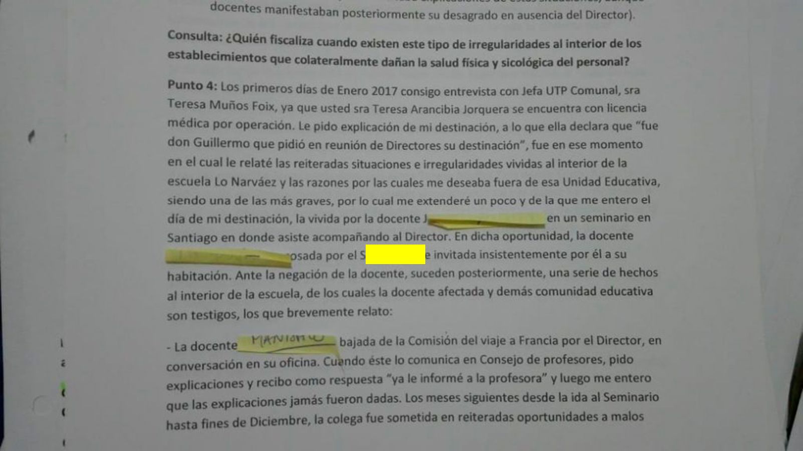 “Fue bajada de la comisión de un viaje a Francia por el director – se lee en la misiva a la que tuvo acceso El Desconcierto–. Los meses siguientes desde la ida al seminario, hasta fines de diciembre, la colega fue sometida en reiteradas oportunidades a malos tratos por parte del Director, a lo que yo intervenía pidiéndole explicaciones de su accionar, recibiendo como respuesta su descontento, lo que desencadenó en abuso de poder de él, en el despido de la docente y en mi destinación”.