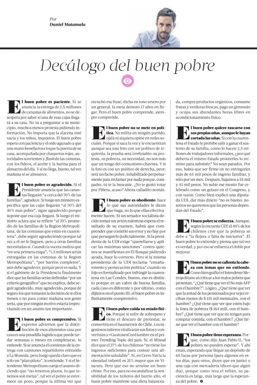 En ese contexto, el periodista Daniel Matamala, columnista habitual de La Tercera, publicó este domingo una columna titulada "Decálogo del buen pobre", donde con ironía y un tanto de destreza literaria, expone de forma crítica la situación vivida por un sector importante de la población, tanto por las precarias condiciones económicas que deben enfrentar, como por la forma en la que el Ejecutivo ha abordado la problemática.