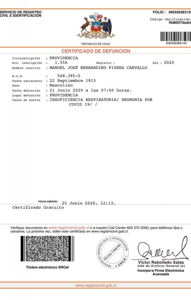 El Registro Civil dio a conocer este jueves el certificado de defunción de Bernardino Piñera, quien falleciera el fin de semana pasado, y cuyo funeral ha generado mucha polémica.