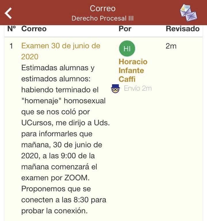 En este caso, la denuncia fue por un correo electrónico del ramo Derecho Procesal III, en donde estudiantes acusaron y funaron al académico Horacio Infante Caffi por ironizar y mofarse del homenaje - palabra que escribió entre comillas -, reduciéndolo solo a una expresión "homosexual", y estableciendo que la acción se había "colado" en el portal UCursos de la institución.
