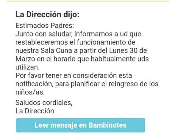 Este es el mensaje enviado por la sala cuna "Creando" a través de correo electrónico a las trabajadoras de Fruna, días después de entrar en la fase 4 de la pandemia: