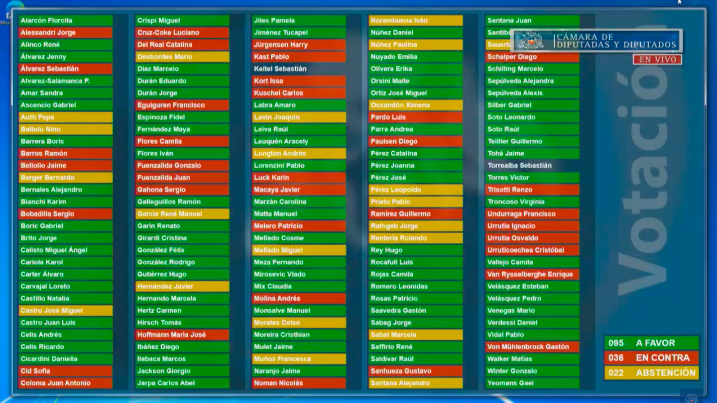 El proyecto fue aceptado en general por 95 votos a favor, 36 en contra y 22 abstenciones, con votos de Renovación Nacional y de la UDI que jugaron un rol fundamental para que esta iniciativa siga su camino legislativo.