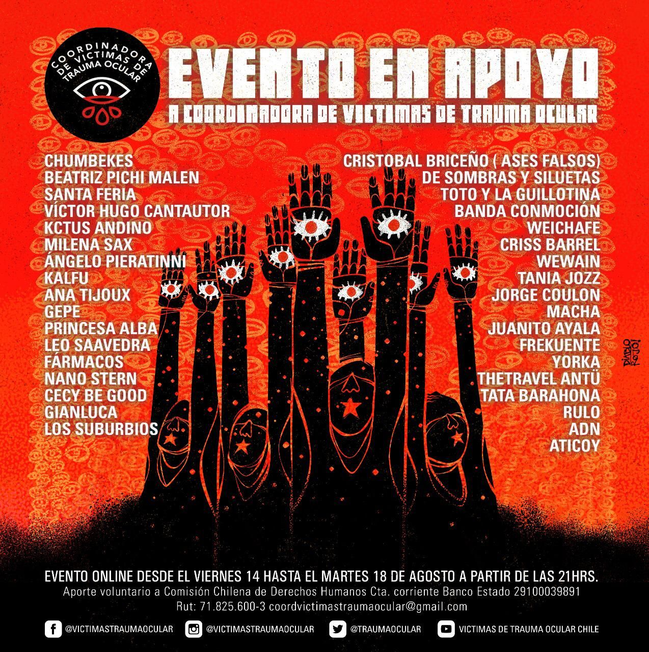 El evento online que reunirá a diversos artistas se desarrollará desde este viernes 14 al martes 18 de agosto a partir de las 21:00 horas, a través del Facebook, Youtube e Instagram de la Coordinadora de Víctimas de Trauma Ocular.