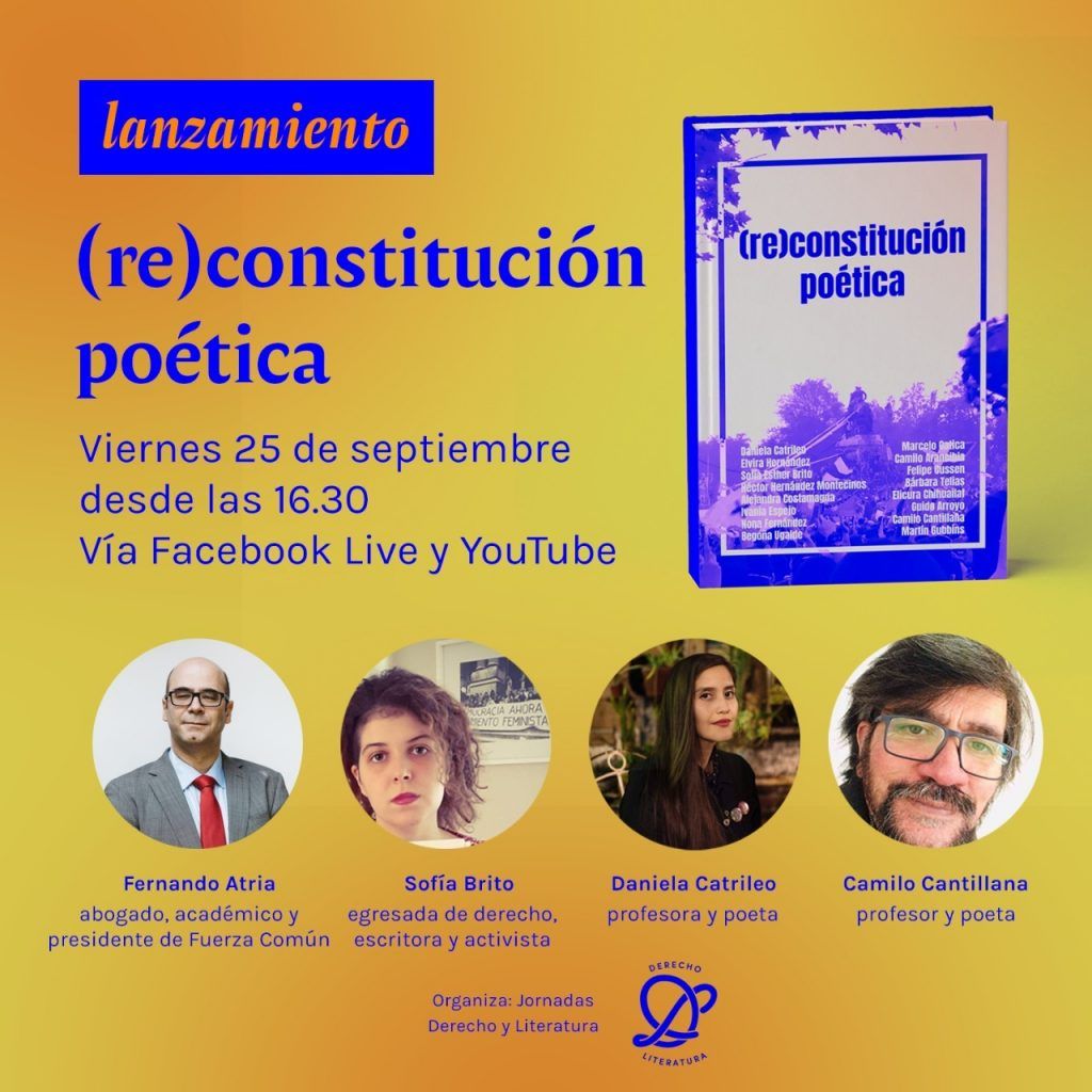 El lanzamiento de la (re)constitución poética se realizará el viernes 25 de septiembre a las 16:30 horas, y contará con la presencia de Fernando Atria y las autoras Daniela Catrileo, Sofía Brito y Camilo Cantillana. El evento será transmitido vía Zoom, a través de las redes sociales de las Jornadas de Derecho y Literatura.