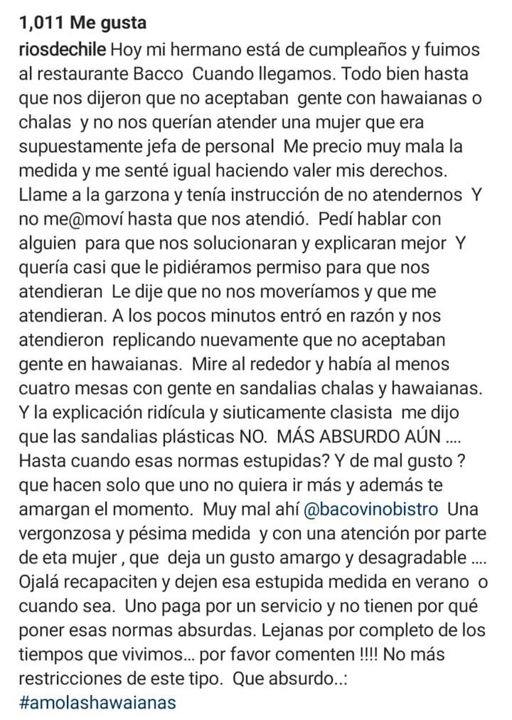 A través de redes sociales, el actual participante de ‘Aquí se Baila’ de Canal 13 relató que “mi hermano está de cumpleaños y fuimos al restaurante Baco. Cuando llegamos todo bien, hasta que nos dijeron que no aceptaban gente con hawaianas o chalas”.