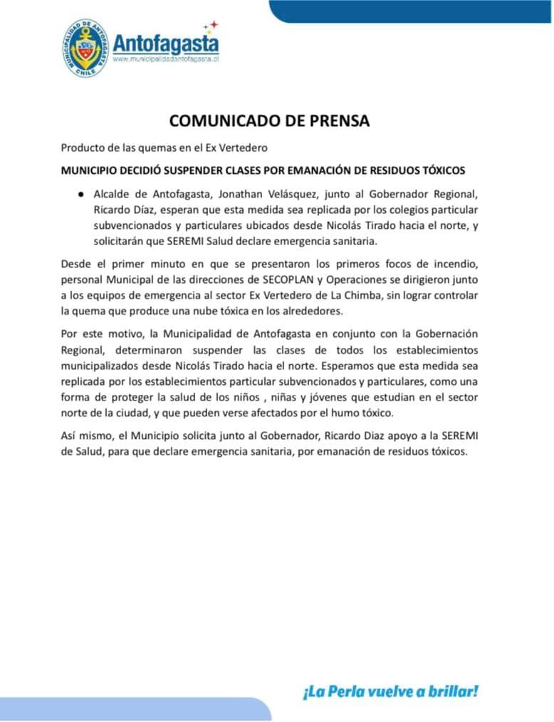 Por su parte, el alcalde Jonathan Velásquez indicó en un comunicado que “esperamos que esta medida (suspensión de clases) sea replicada por los establecimientos particular subvencionados y particulares, como una forma de proteger la salud de los niños, niñas y jóvenes que estudian en el sector norte de la ciudad”.